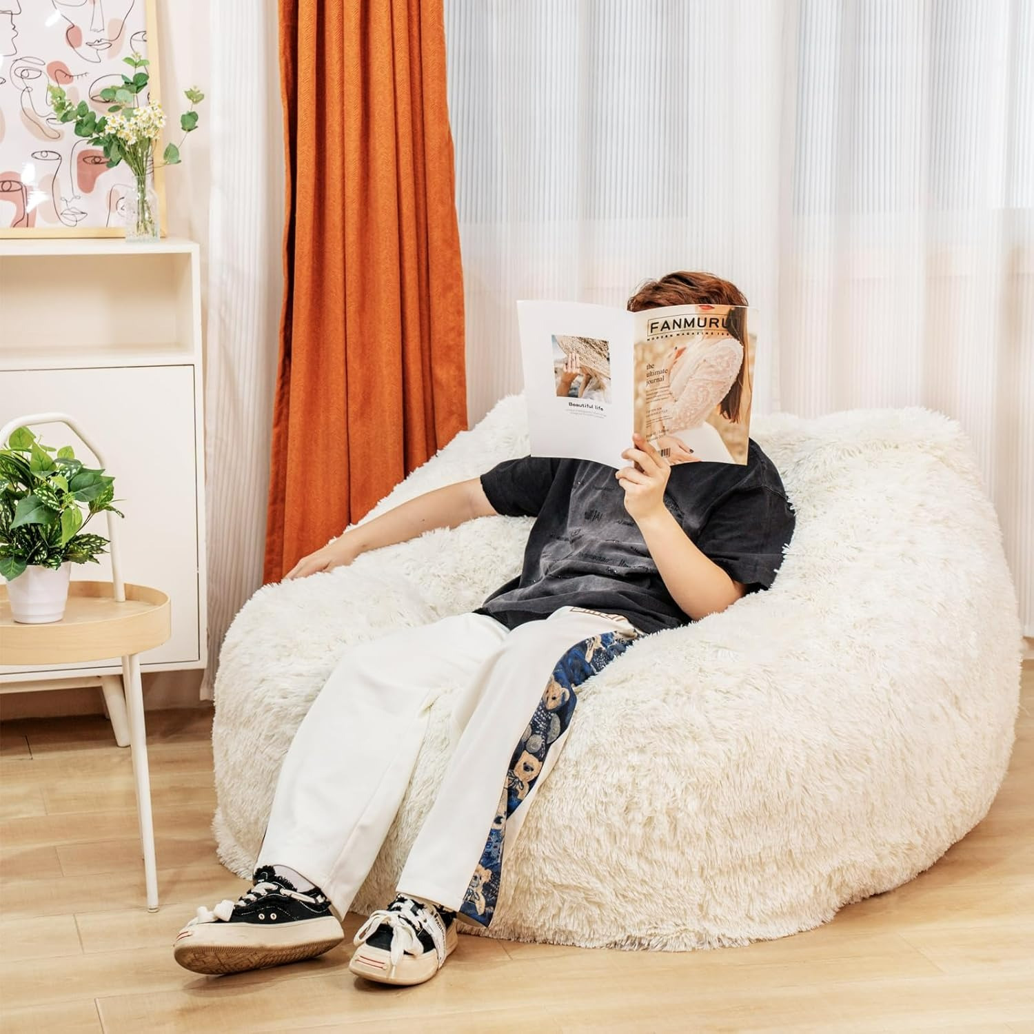 Bean Bag Sofa: Our bean bag furniture for adults is stuffed with shredded soft memory foam stuffing that is highly durable and maintains its shape while enhancing comfort levels. The bean bag cover. encased in faux fur with double stitching. offers maximum strength and weight-bearing capacity. The removable double-stitched faux fur cover is soft to the touch. machine washable. and easy to maintain.
